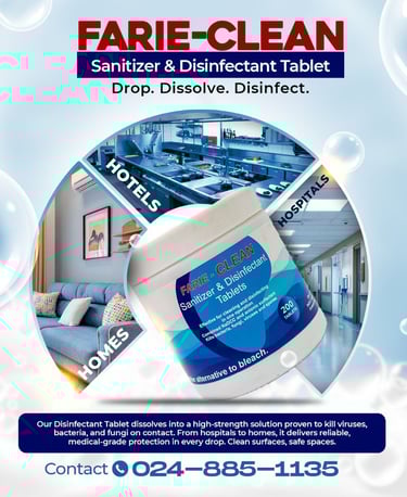 Bleach Tablets to dissolve in water that can be used to disinfect surface and floors for homes, hotels, hospitals etc. Compact packaging and long shelf life make it ideal for cleaning companies , home owners and large institutions alike.